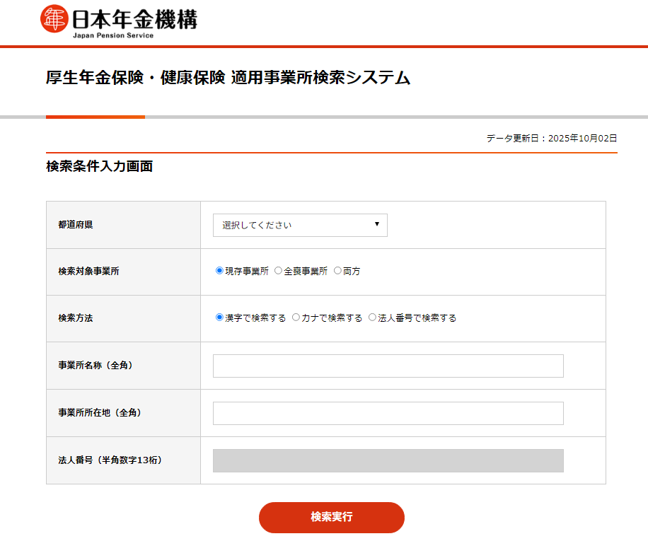 日本年金機構の「厚生年金・健康保険適用事業所 検索システム」で検索できます。https://www2.nenkin.go.jp/do/search_section/